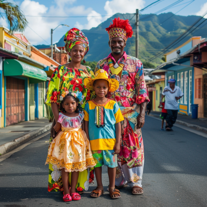 Traditional Creole wear, characterized by colorful madras fabric, symbolizes Dominica's cultural heritage and the blend of African, European, and indigenous influences.