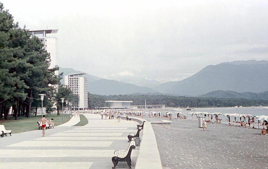 Вид на набережную, пляж, пансионаты "Золотое руно" и "Бзыбь", столовую и кассы