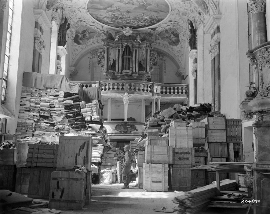 Bavière, Ellingen, Des piles d'oeuvres d'art stockées dans une église