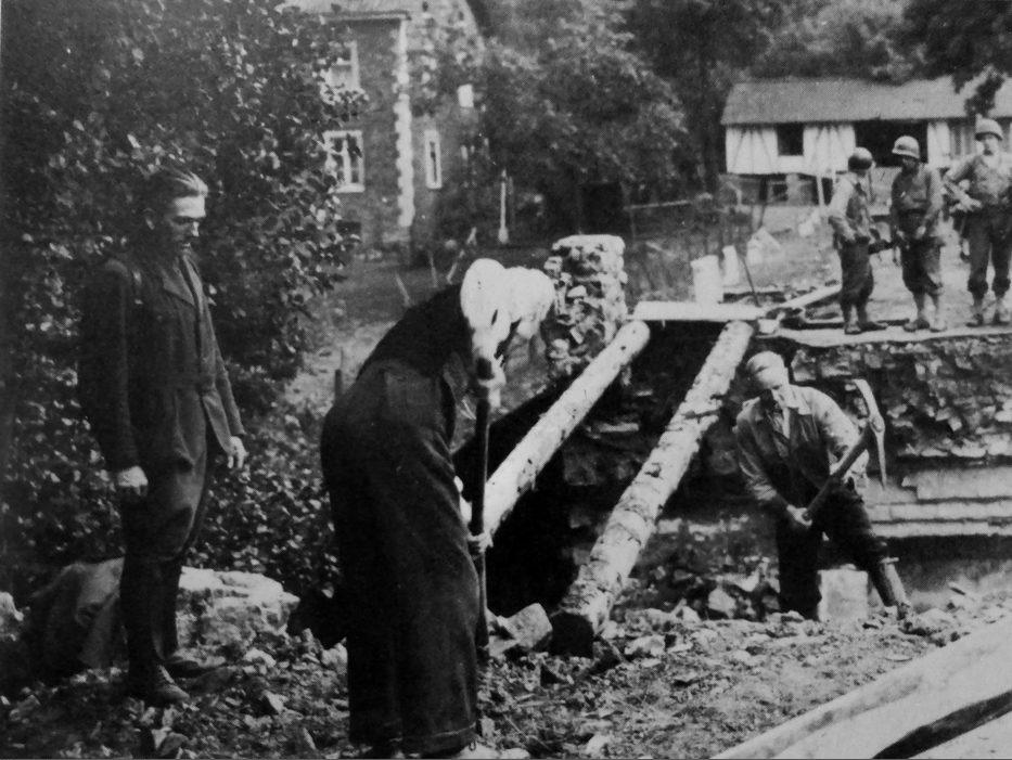 Bewohner des eroberten Dorfes Rott stellen die gesprengte Brücke wieder her