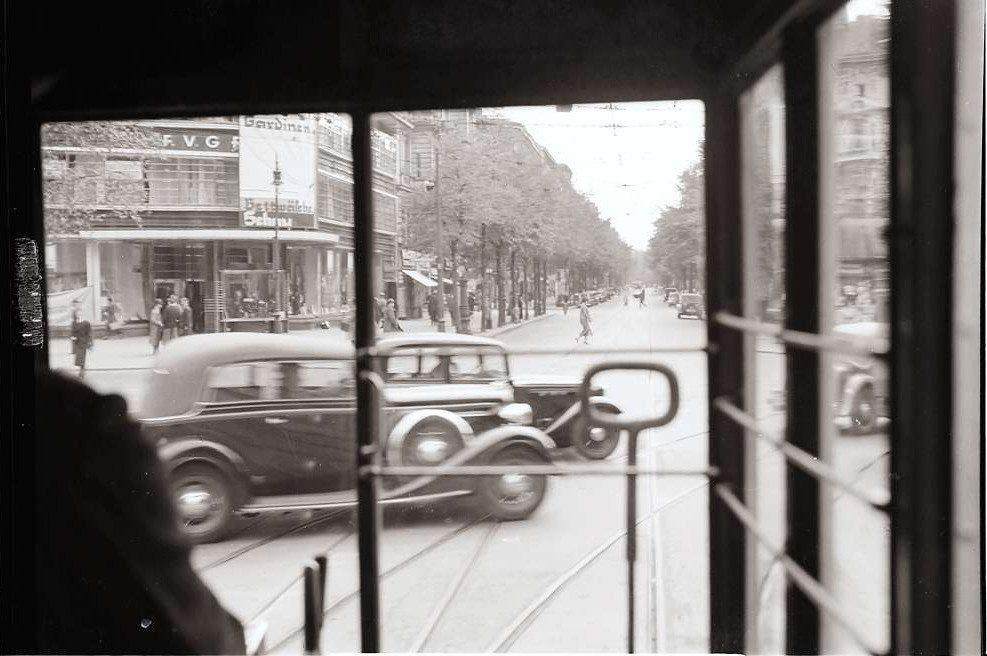 Blick aus der Straßenbahn auf die Kreuzung Kurfürstendamm / Joachimsthaler Straße mit dem Wäschehaus Grünfeld (rechts)