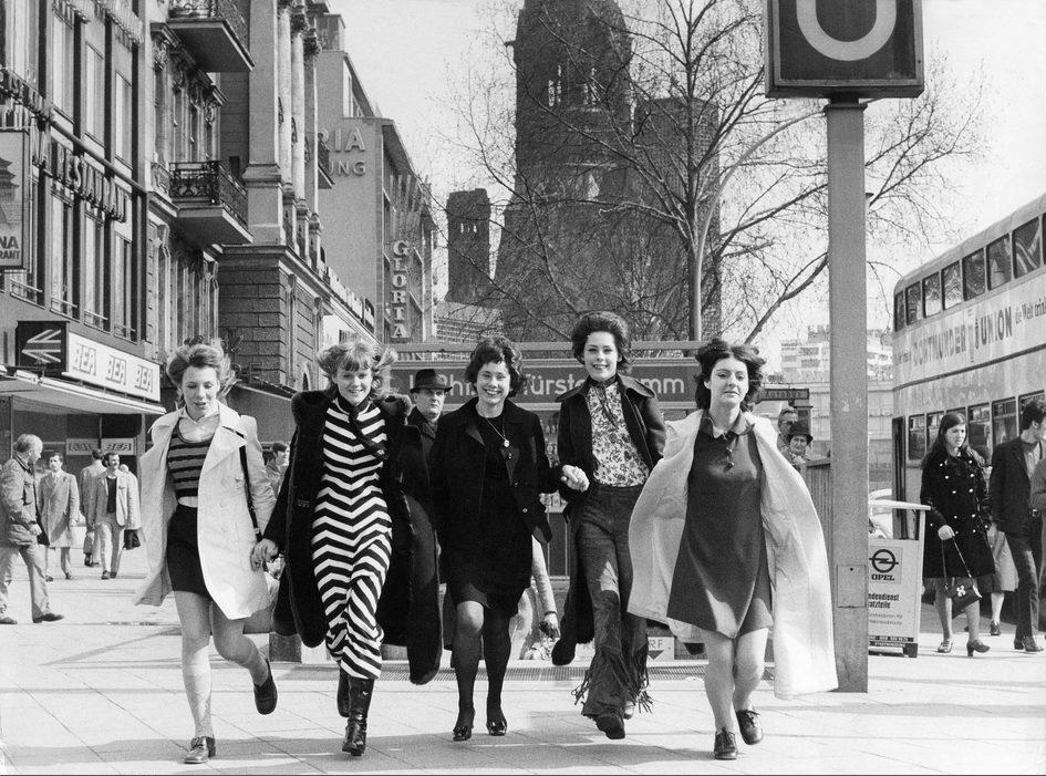 Fünf junge Frauen laufen nebeneinander auf dem Kurfürstendamm