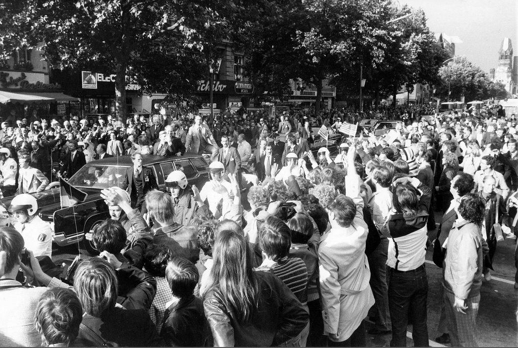 Carter fährt im offenen PKW über den Kudamm