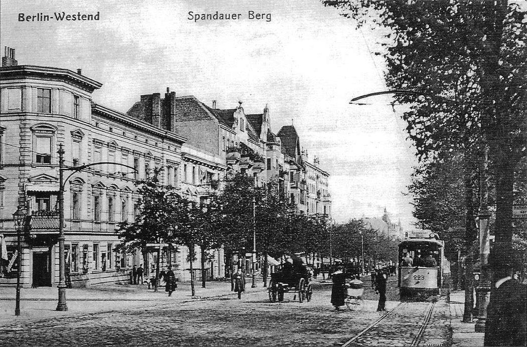 Spandauer Berg (heute Spandauer Damm), Ecke Fürstenbrunner Weg mit einem Triebwagen