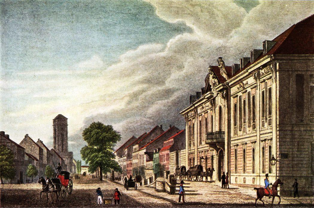 Blick nordostwärts durch die Lindenstraße zur ev. Jerusalemskirche. Königliche Kammergericht
