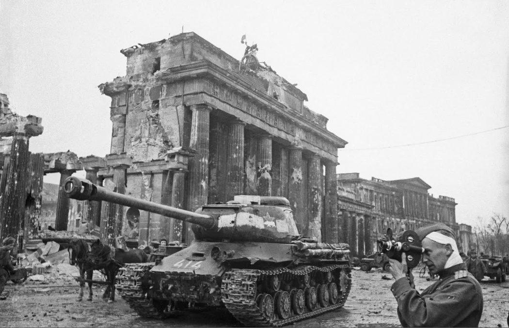 Kameramann R.L. Carmen filmt neben dem IS-2 Panzer nahe dem Brandenburger Tor
