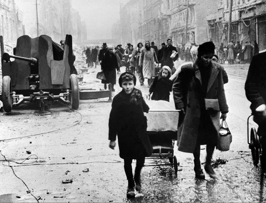 Flüchtlinge marschieren nach dem Ende der Kämpfe in der Friedrichstraße in Berlin