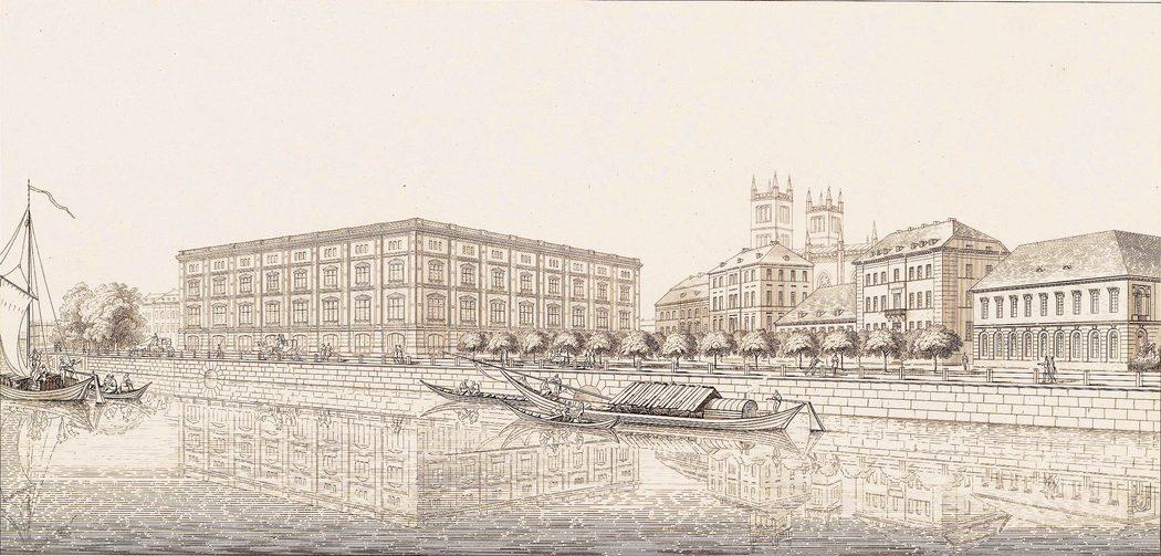 Perspektivische Ansicht von Nordosten über die Spree