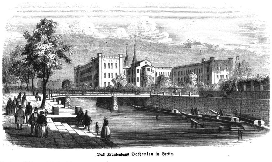 Luisenstädtischer Kanal in Berlin-Kreuzberg mit dem Bethanien-Krankenhaus