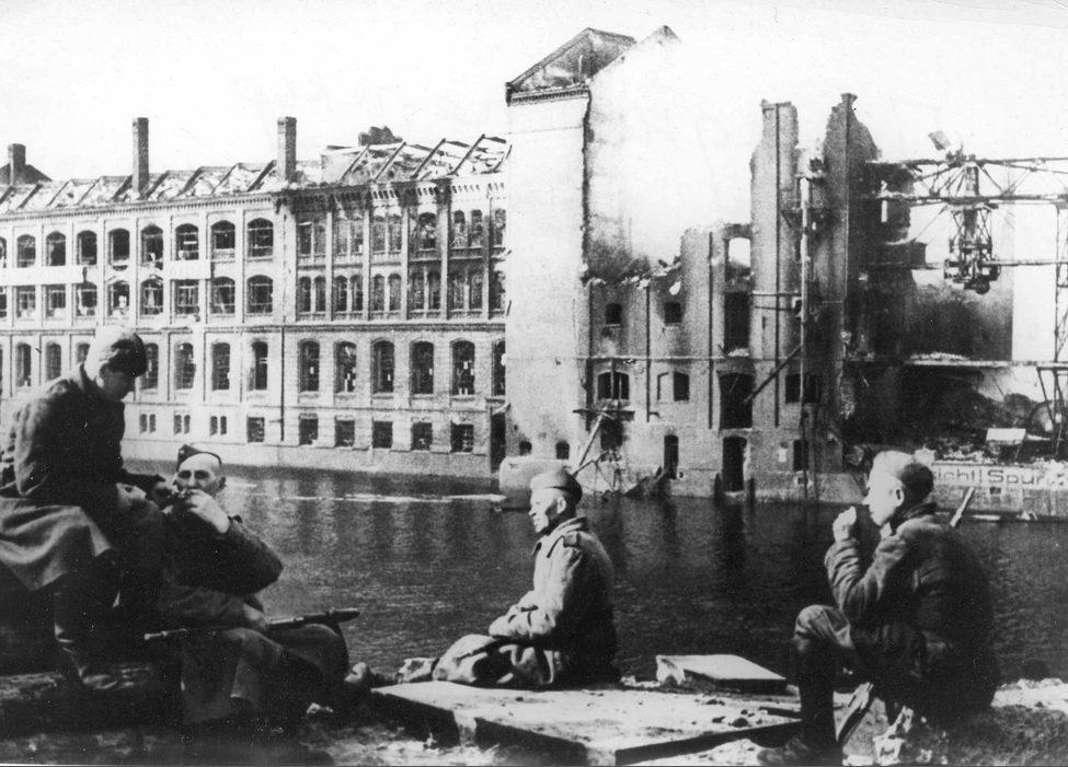 Sowjetische Soldaten ruhen am Ufer der Spree in Berlin