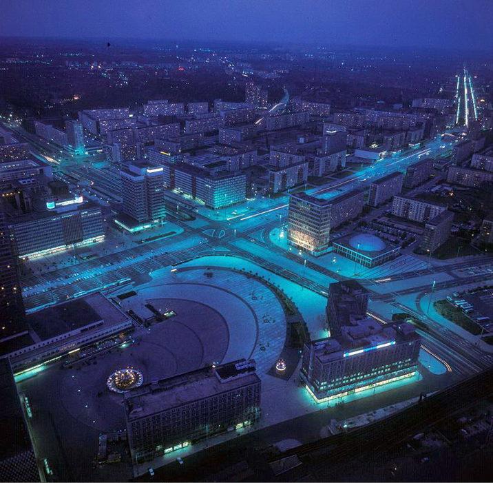 Blick auf den beleuchteten Alexanderplatz und Wohnbauten an der Karl-Marx-Allee