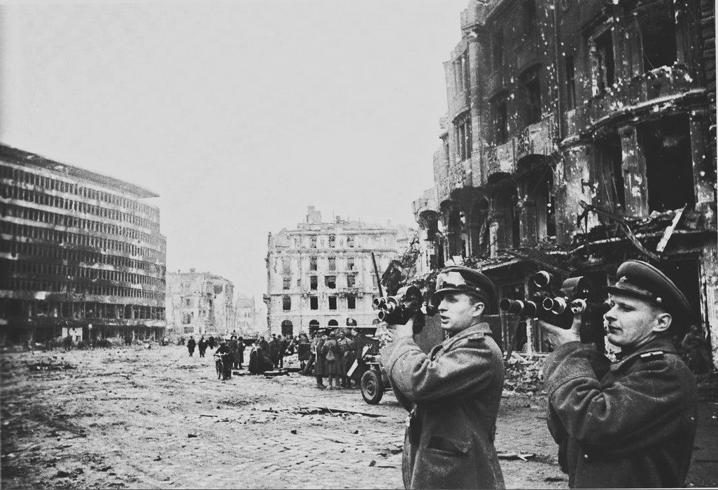 Фронтовые кинооператоры братья Александр и Евгений Алексеевы ведут съемку на Потсдамской площади
