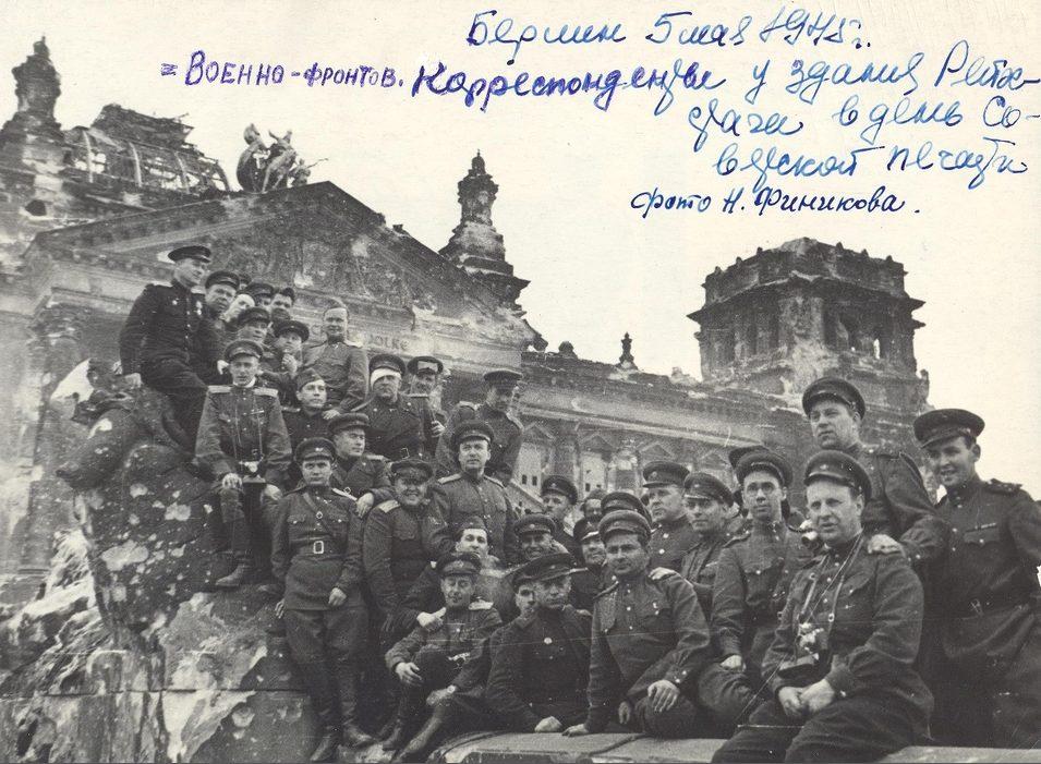 Военно-фронтовые корреспонденты у здания Рейхстага