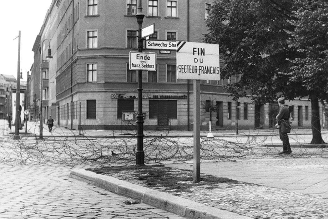 Mauerbau: Stacheldrahtsperren in der Schwedter Straße Ecke Bernauer Straße