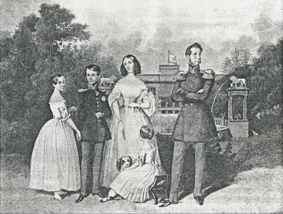 Familienleben in Glienicke: das Prinzenpaar mit seinen Kindern vor der Löwenfontäne
