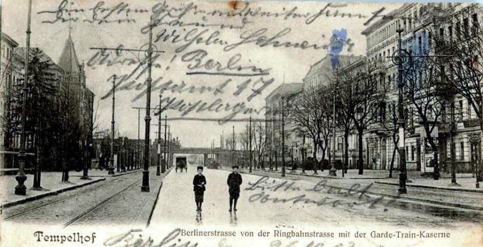 Berliner Straße von der Ringbahnstraße mit der Kaserne des Garde-Train-Bataillons