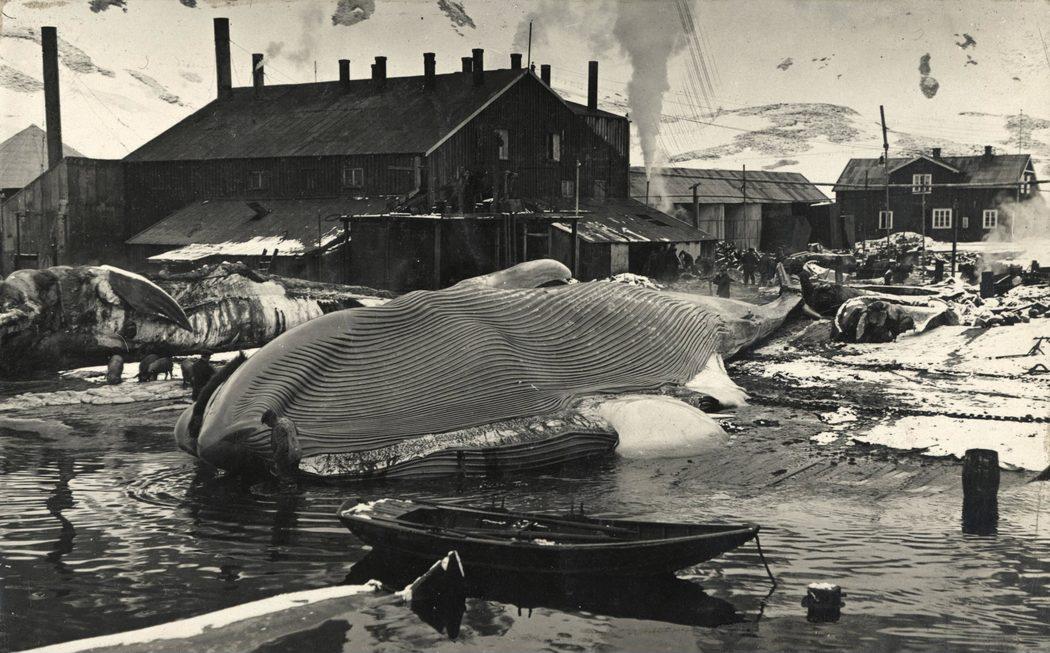 A blue whale lies on the flensing platform at the Grytviken