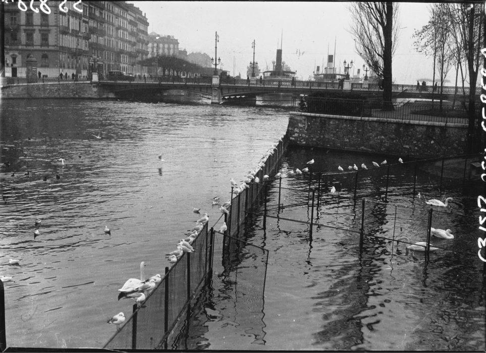 Photographie prise du pont des Bergues, à l'arrière plan le pont du Mont-Blanc