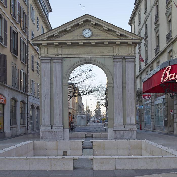 Rue Necker: fontaine et porte de l'ancien panorama de Plainpalais