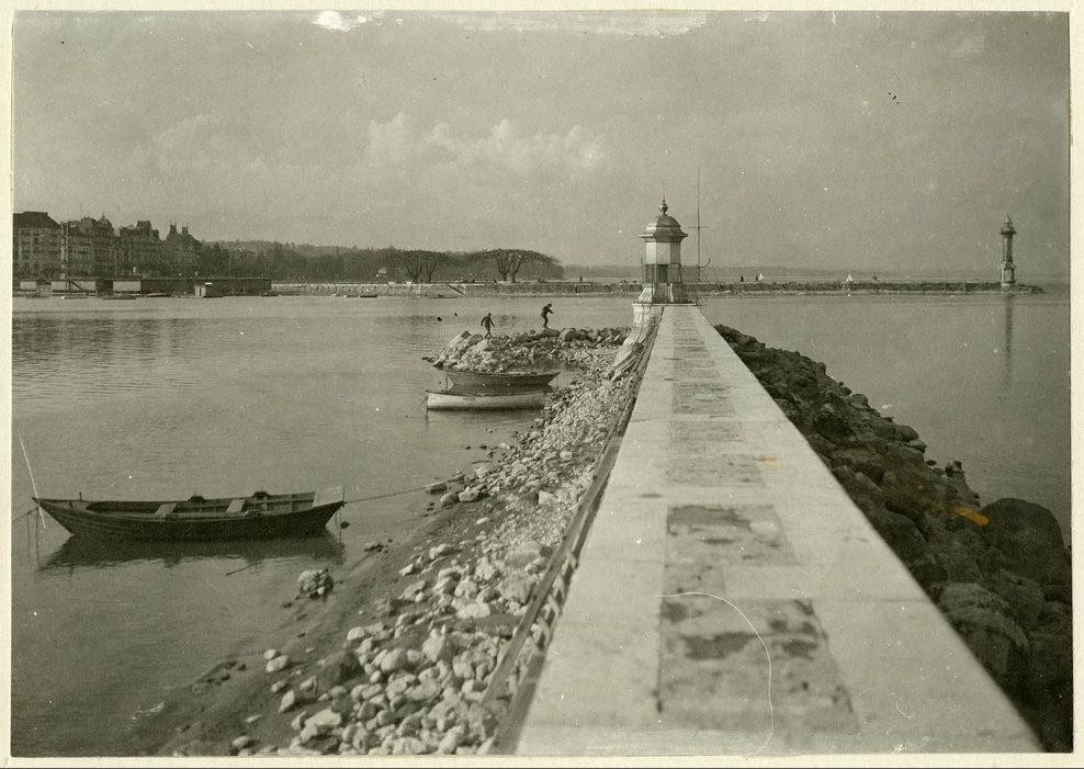 Quai Gustave-Ador: jetée des Eaux-Vives, avec en arirère-plan les bains et le phare des Pâquis