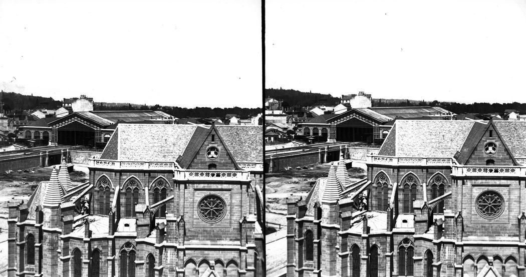 Cornavin: le chevet et le transept de l'église Notre-Dame vus du sud; à l'arrière-plan la gare (stereofoto)