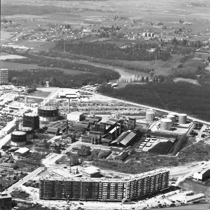 Vernier, les Libellules, l'usine à gaz et le chantier du Lignon: vue aérienne