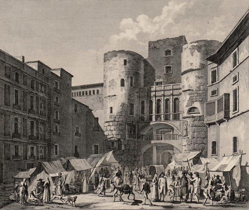 Vista de la Plaza nueva y de una de las Puertas antiguas de Barcelona