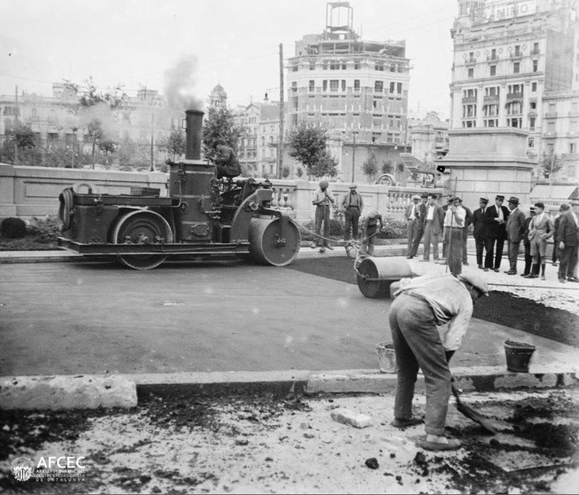 Treballadors pavimentant la plaça Catalunya i un grup de gent observant al fons