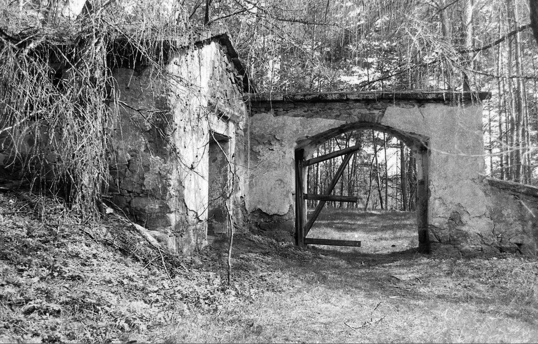 Drážkov, márnice na židovském hřbitově, márnice a hřbitovní brána - stav před opravou