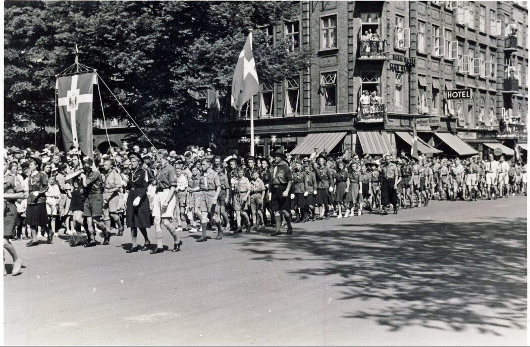 Spejdere i optog op ad Sønder Alle forbi Rådhuspladsen