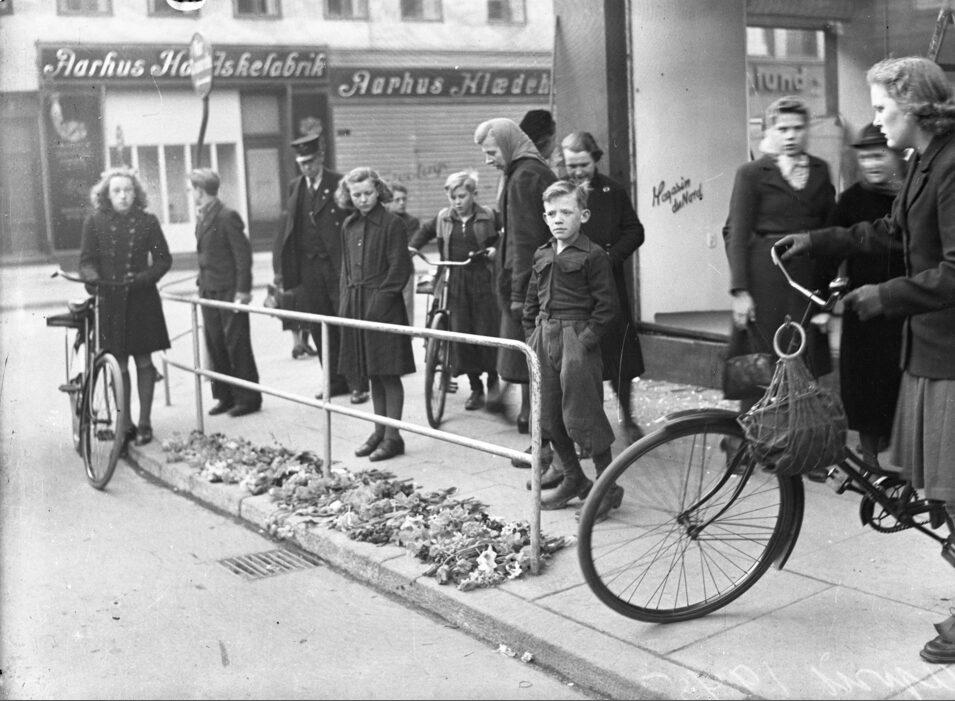 Hjørnet ved Magasin. 2 vagtværnsmænd mindes, blomster lagt på drabsstedet