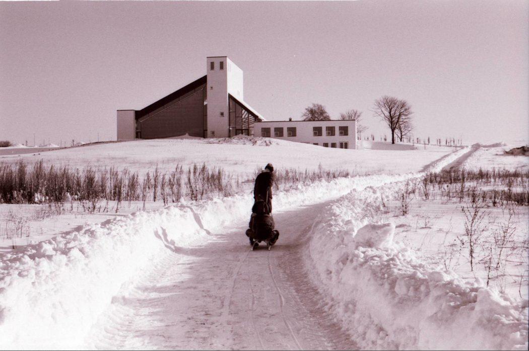 Børn i slæde op af sneklædt sti op til Skjoldhøj Kirke