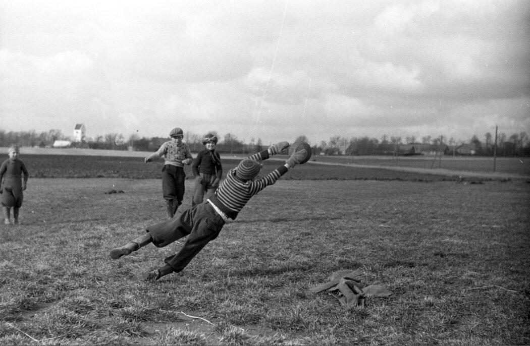 Egå. Drenge spiller fodbold på mark