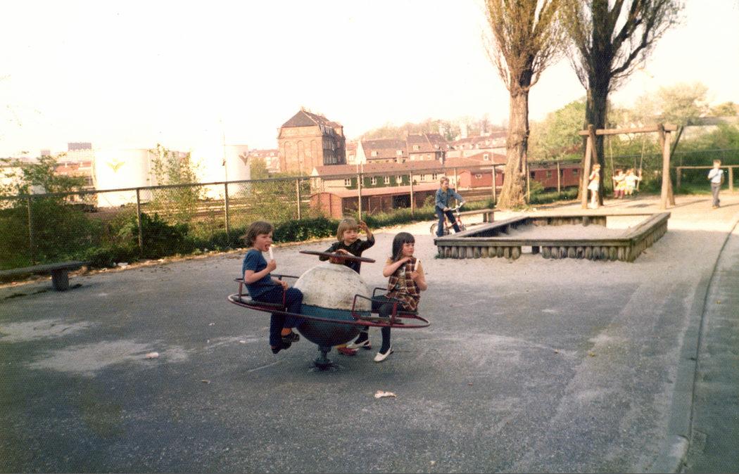 Børnene Claus, Marianne og Tina leger på legepladsen i Ankersgade nær ved Ringgadebroen