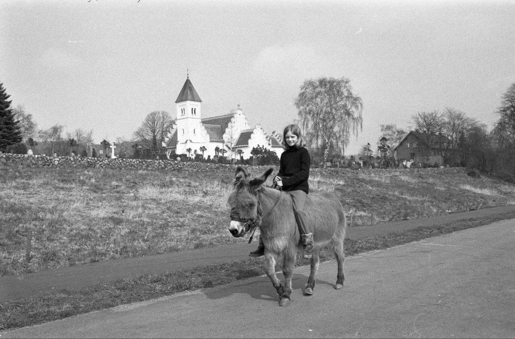 Brabrandstien. Pige på æsel rider foran Brabrand Kirke