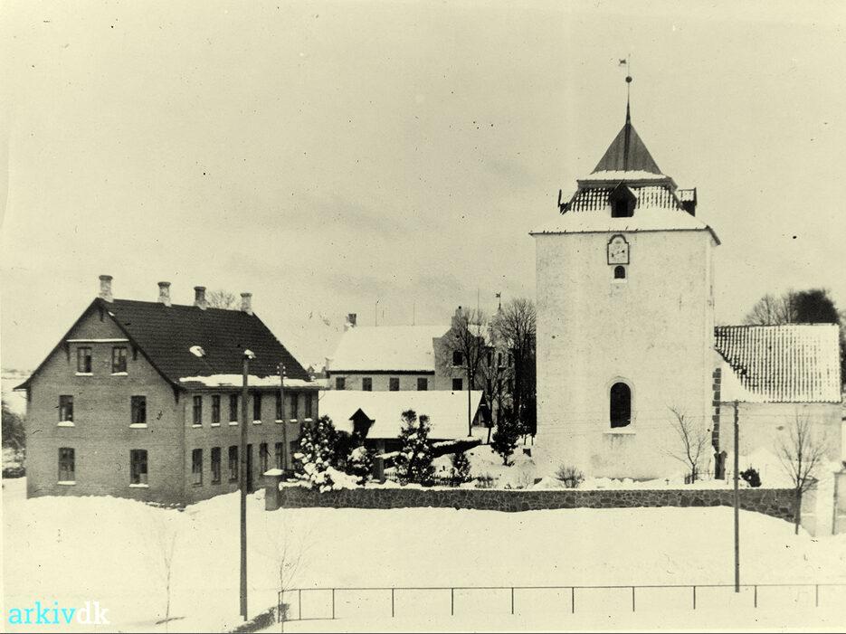 Viby Kirke. Til venstre Viby gamle skole og i baggrunden højskolen