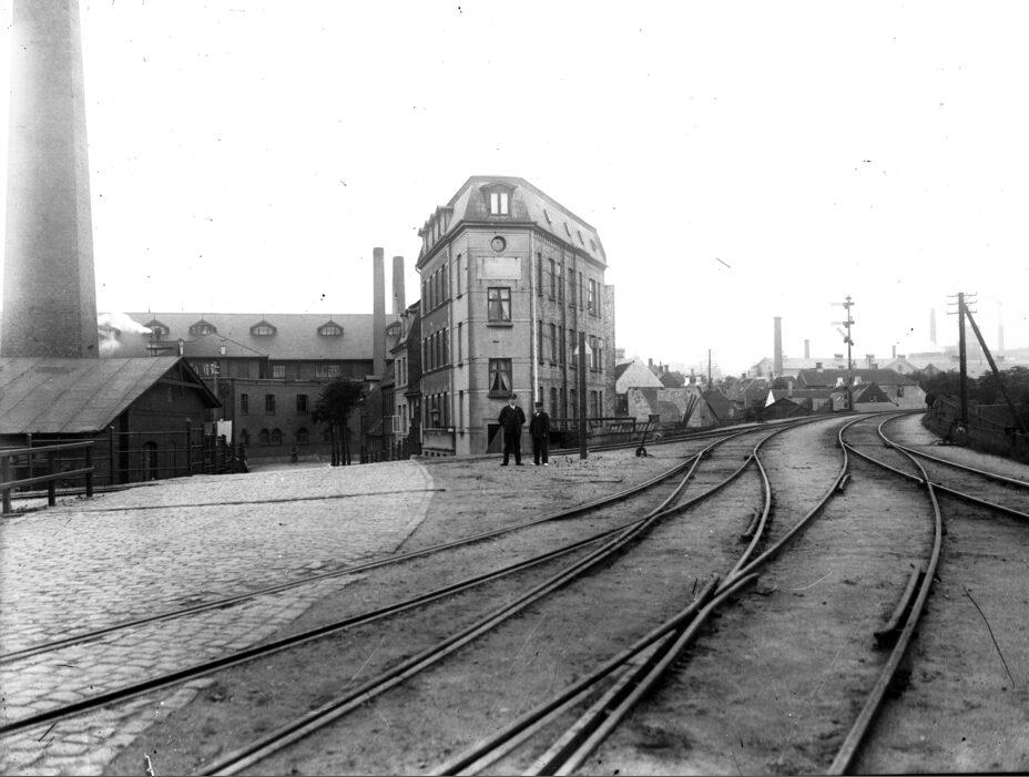 Århus Svineslagteri og Århus Kommunale Værker set fra jernbaneoverskæringen