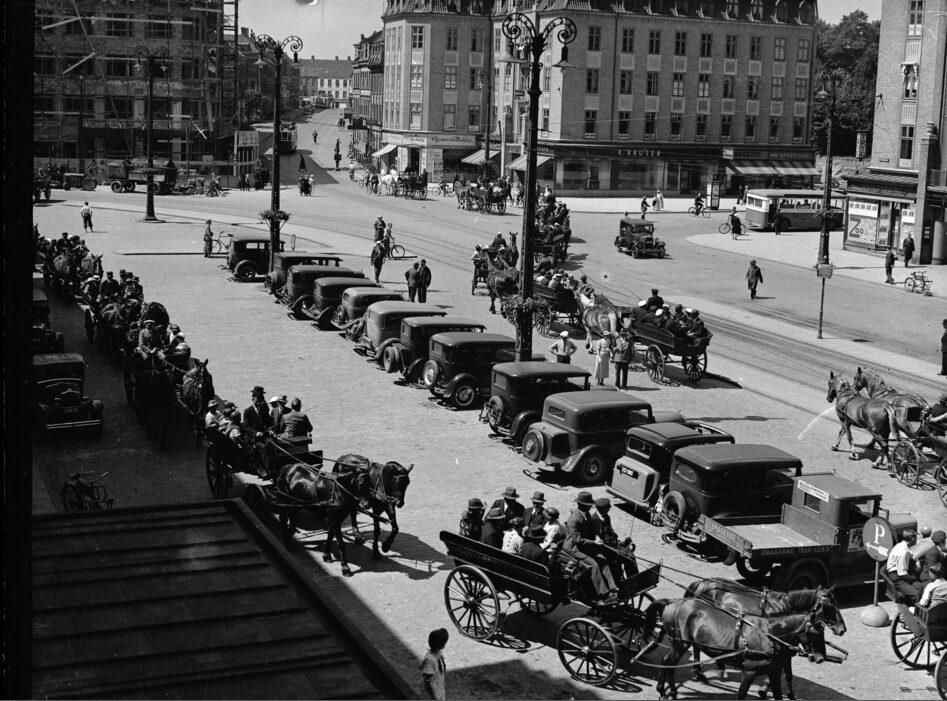 Banegårdpladsen med biler og hestevogne