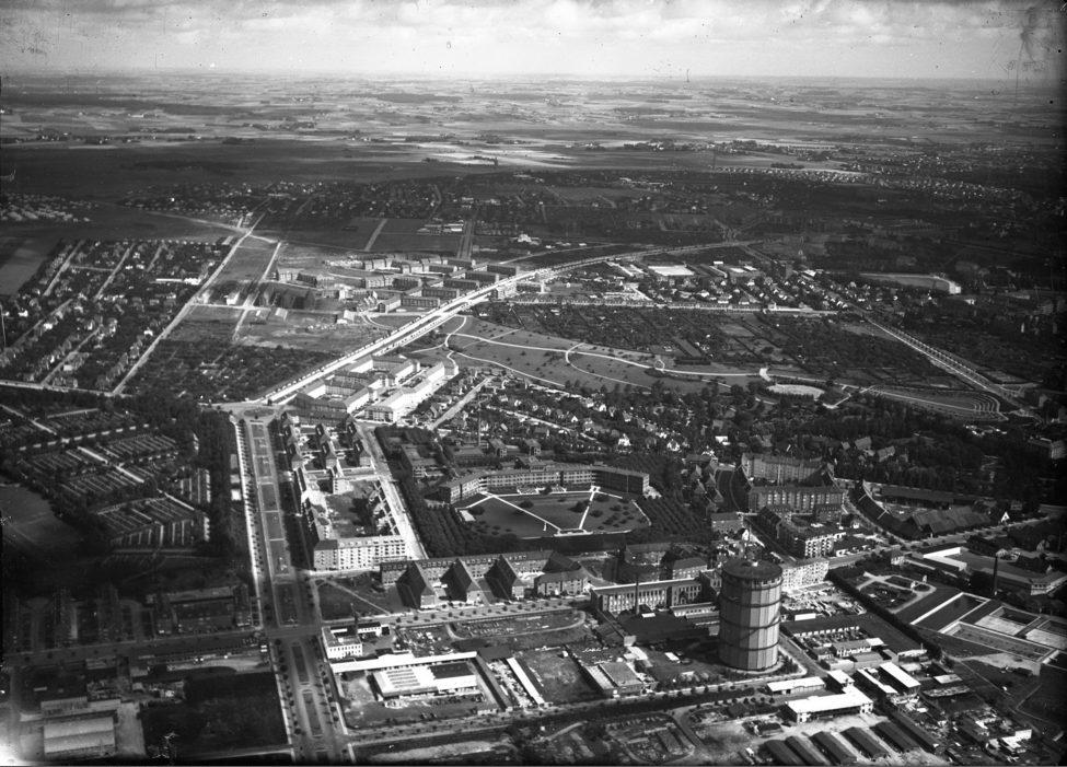Aarhus set fra Luften. Ringgade / Silkeborgvej, gasbeholder på Dollerupvej og Aarhus Amtssygehus
