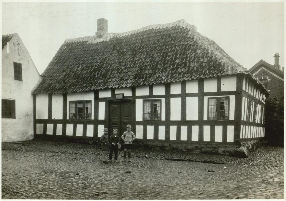 Ebeltoft. Drenge foran hus på hjørnet af Villadsgyde og Nedergade
