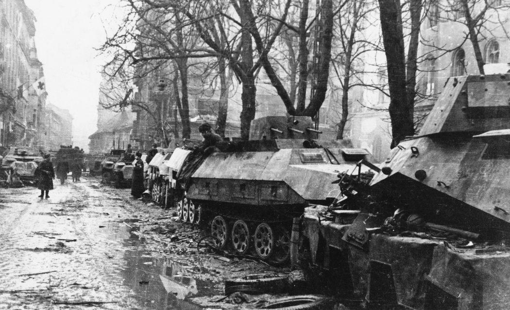 Zsákmányolt német páncélozott járművek a budapesti Fö utcán
