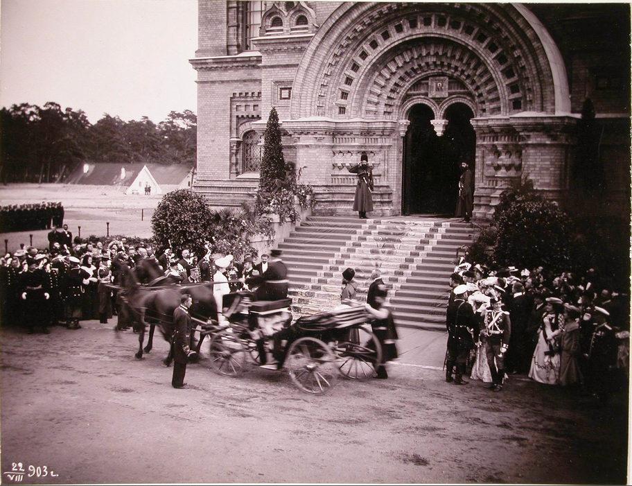 Либава. Группа военных придворных, казаки собственного его императорского величества конвоя, горожане встречают прибывающих для освящения Морского собора императора Николая II и императрицу Александру Федоровну