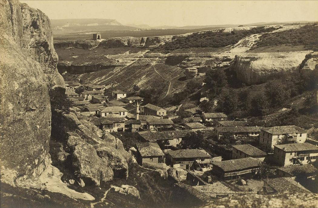 Деревня Черкес-Кермен, вид на Девичью башню (Кыз-Куле)