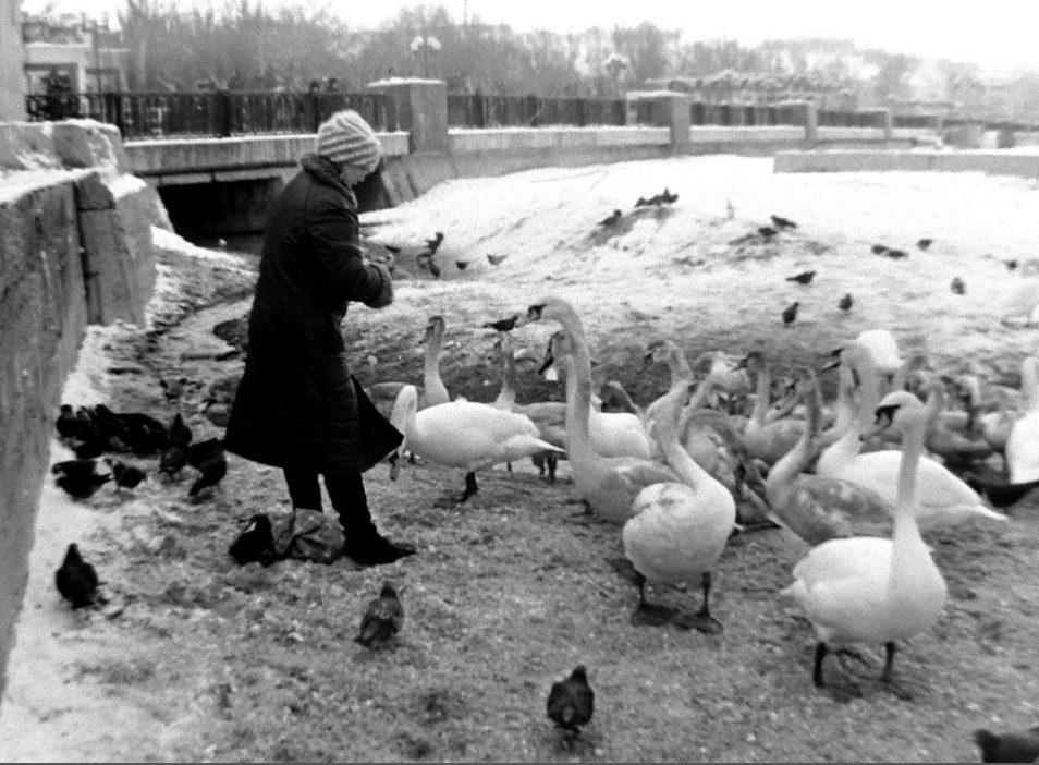Кормление лебедей на зимнем пляже