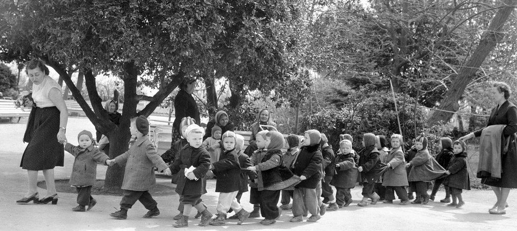 Воспитатели ведут группу детей в парке
