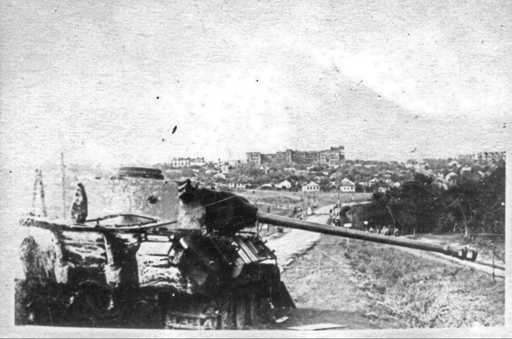 Подбитый немецкий танк на Больничном проспекте города Сталино (Донецк)