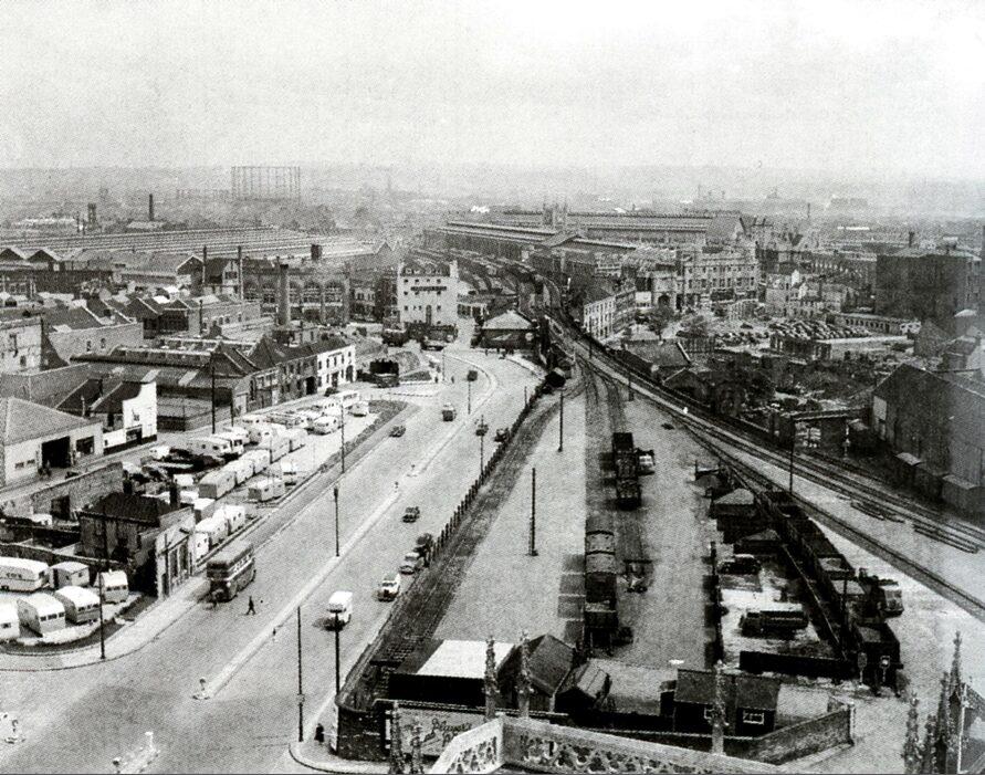 The railway goods yard at the side of the St Mary Redcliffe church with the line from Temple