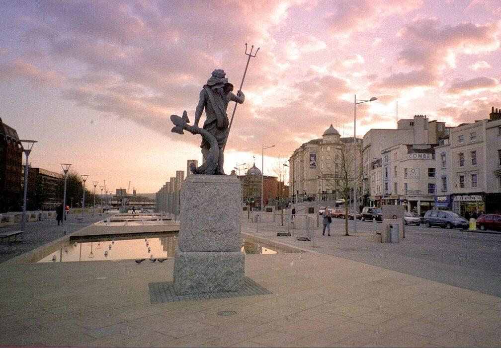Sunset over the Neptune statue in Bristol Centre