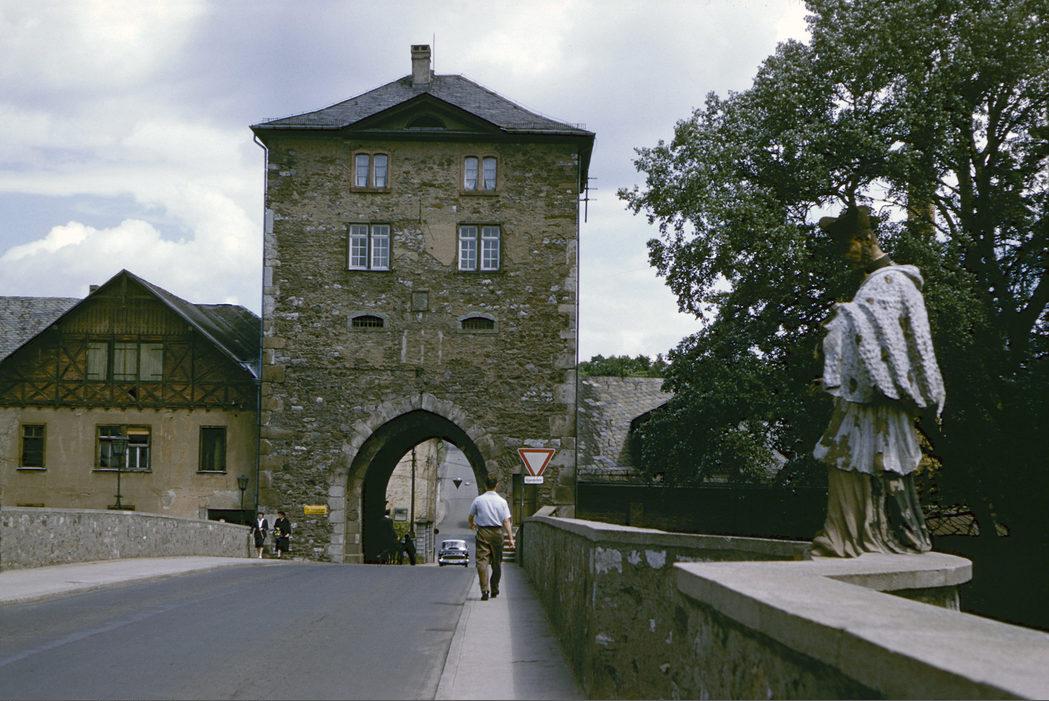 Statue on bridge, with gatehouse, Limburg an der Lahn