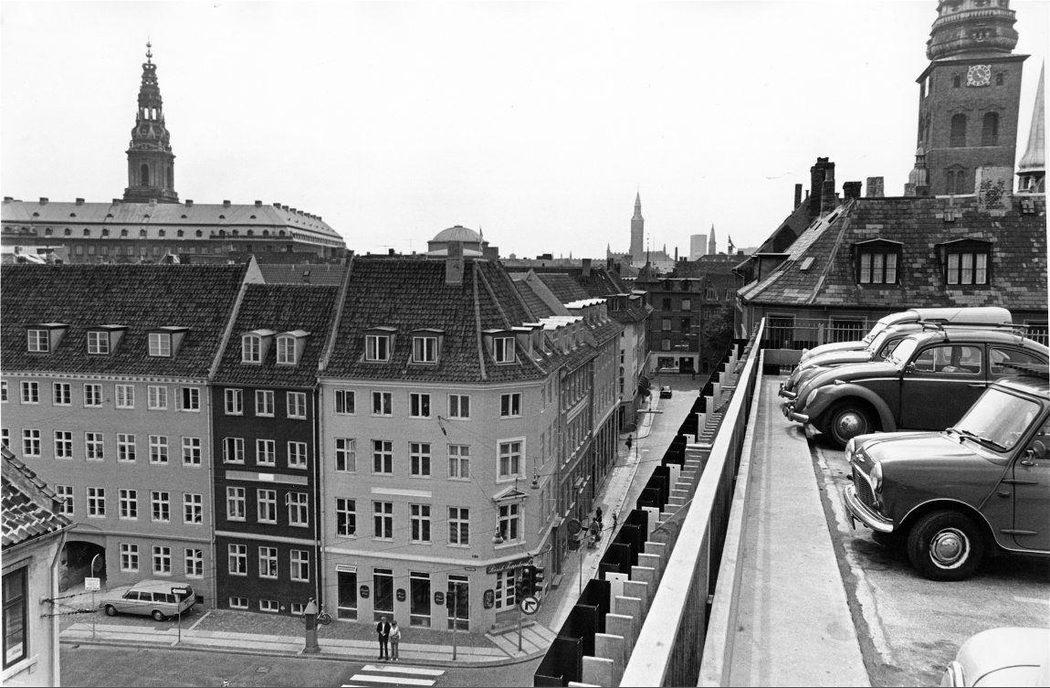 Her ses biler parkeret på taget af Magasins forretning på Vingårdstræde